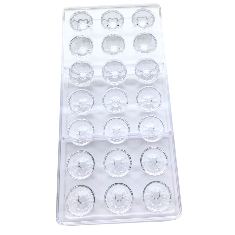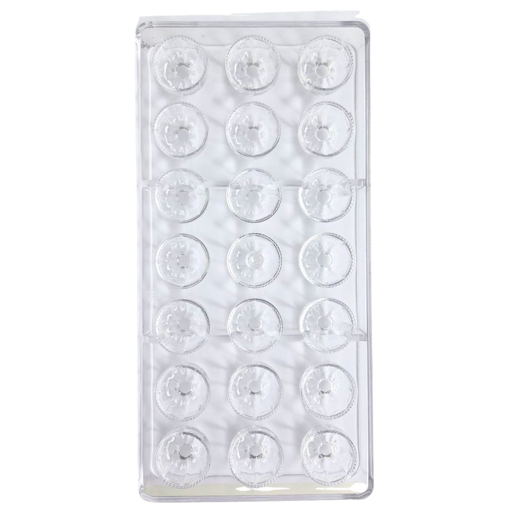 Formă pentru praline rotunde decorative, realizată din plastic alimentar transparent, ideală pentru obținerea unor praline elegante cu model reliefat tip floare.