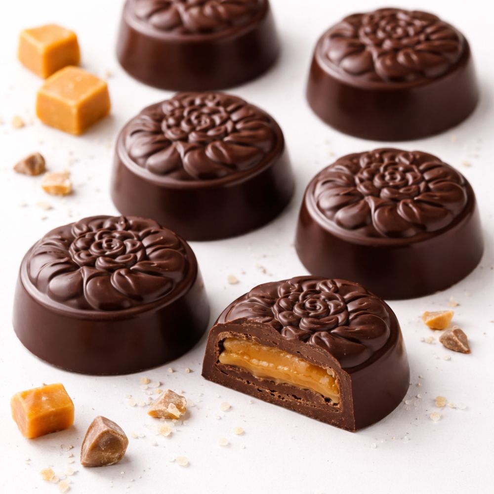 Rezultatul: praline rotunde, lucioase, cu model decorativ elegant și interior cremos.