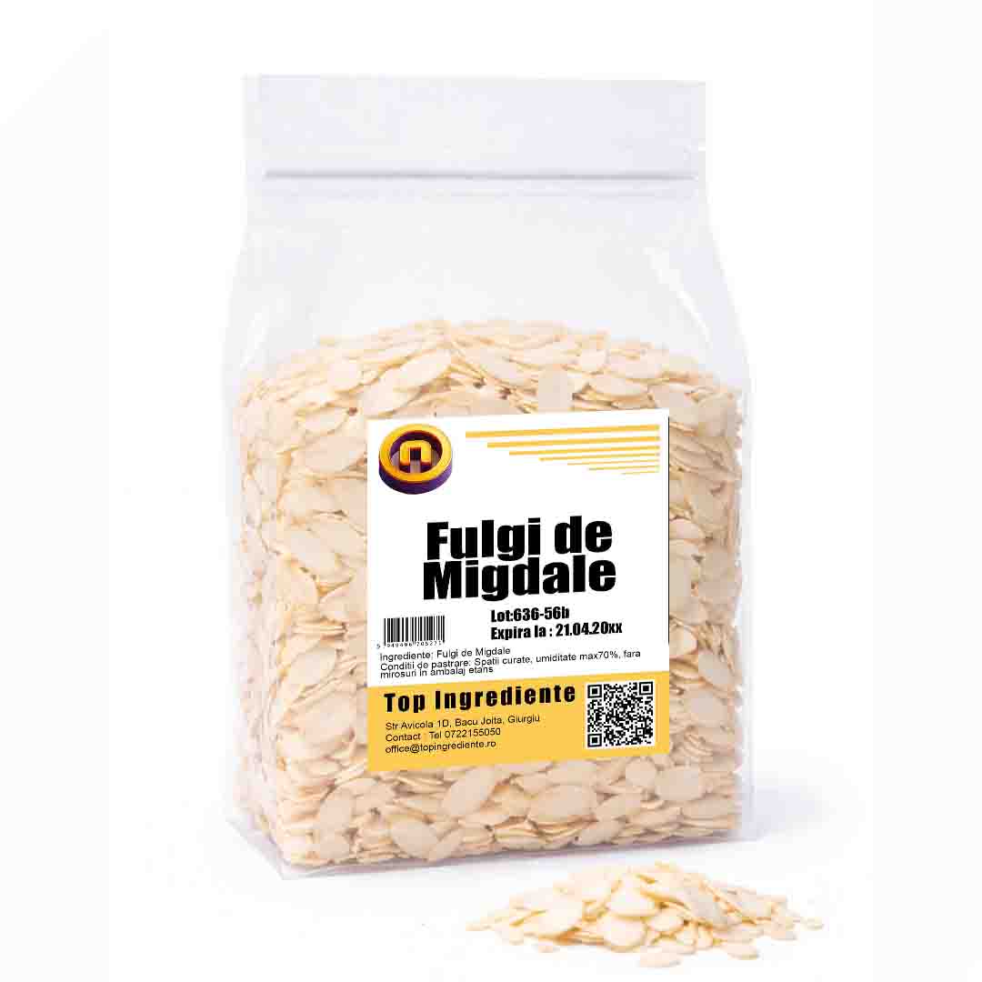 Fulgii de migdale sunt obtinuti prin felierea fina a migdalelor decojite, pastrand gustul natural, usor dulceag si textura crocanta. Sunt un ingredient versatil, folosit frecvent in patiserie, cofetarie si bucatarie gourmet, oferind preparatelor atat valoare nutritiva, cat si un aspect elegant.